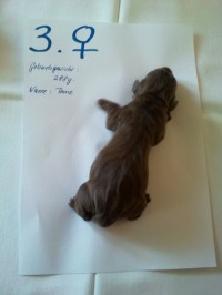 Welpe Nr. 2; zweiter Junge; Geburtszeit: 08.39 Uhr; Geburtsgewicht: 308 g; kleiner weißer Fleck auf der Brust ( wie Papa); ev.Name: Andy